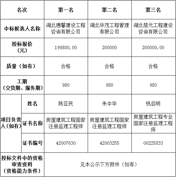 金投•彩虹湾一期(S1号楼综合商业)及配套工程金投•彩虹湾一期(S1号楼综合商业)及配套工程(监理)于2023年03月01日在湖北省电子招投标交易平台发布招标公告,2023年04月03日在松滋市开标室(1)开标,并于2023年04月03日完成评标工作。根据评标委员会提交的评标报告,湖北松滋金投置业有限公司已经确认评标结果,现进行评标结果公示。
