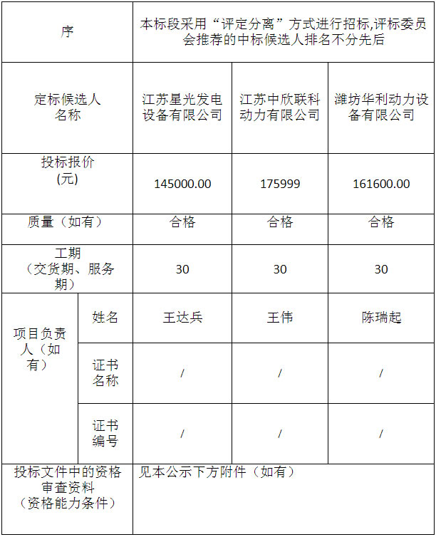 金投•彩虹湾一期(S1号楼综合商业)及配套工程金投•彩虹湾(一期S1#楼综合商业)柴油发电机组采购及安装项目于2023年11月30日在湖北省电子招投标交易平台发布招标公告,2023年12月25日在松滋市开标室(2)开标,并于2023年12月25日完成评标工作。根据评标委员会提交的评标报告,湖北松滋金投置业有限公司已经确认评标结果,现进行评标结果公示。