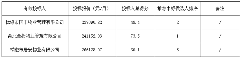 金松•尚含绿城前期物业服务项目于2019年08月04日在松滋新闻网(网址:http://www.songzinews.net)(媒介名称)上发布招标公告,2019年09月11日在松滋市乐乡凯瑞大酒店五楼会议室开标,并于2019年09月11日完成评标工作。根据评标委员会提交的评标报告,湖北松滋金投置业有限公司已经确认评标结果,现进行评标结果公示。