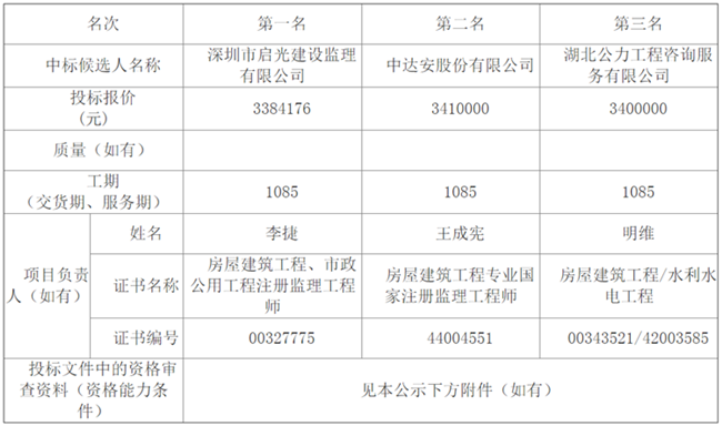 松滋市金投·新城壹品建设项目第三标段监理松滋市金投·新城壹品建设项目第三标段监理于2019年09月04日在湖北省电子招投标交易平台发布招标公告,2019年09月27日在开标室(1)开标,并于2019年09月27日完成评标工作。根据评标委员会提交的评标报告,湖北松滋金投置业有限公司已经确认评标结果,现进行评标结果公示。